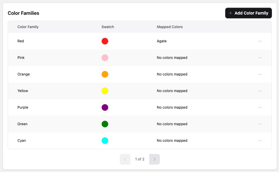 Color families group raw product colors under a consistent parent color such as Red, Blue, or Mixed. This improves storefront filtering and helps Vertex AI understand your catalog more consistently.